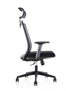 基材: 黑色尼龍加纖椅身,配尼龍?zhí)鼐W(wǎng),帶活動(dòng)頭枕, 設(shè)有附合人體工程學(xué)的上下調(diào)節(jié)無極檔腰靠·PU扶手面可配2D升降或不升降功能,配原位鎖定或者三檔鎖定底盤,帶座板滑動(dòng)功能,85#沉口4公分黑色汽桿,∮340黑色尼龍腳∮60MM PU輪黑色輪